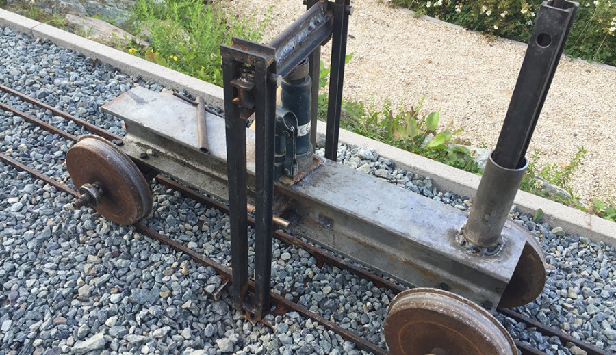 Die Achsen wurden unter den Doppel T-Träger montiert. Der Oberbau, die eigentliche Hebevorrichtung, wurde aus einem Hydraulik-Waagenheber und zwei Armen, welche mittels Gelenken an einer Brücke befestigt wurden, gebaut. Die beiden Arme besitzen an ihren Enden zwei Krallen, die man wunderbar unter dem Gleis positionieren kann.