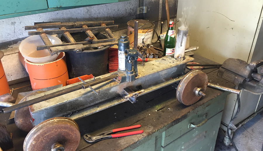 Das Prinzip ist einfach wie genial. Der Unterbau musste schwer sein. Also nahmen wir einen 100er Doppel T-Träger in ca. 1 Meter Länge und zwei, nicht mehr zu gebrauchende Achsen einer nie fertig gestellten Feldbahnlok. Ich nehme an, diese Feldbahnlok sollte im Masstab 1:1 allerdings auf 7 1/4 Zoll gebaut werden, denn eine Achse mit zwei Vollscheibenrädern brachte stolze 20 kg auf die Waage.